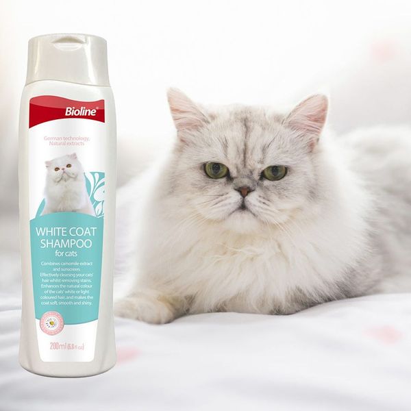 شامپو گربه سفید بایولاین تحت لیسانس آلمان و ساخت چین ویژه گربه های با موهای روشن حاوی عصاره بابونه و ضدآفتاب، که می تواند به طور موثر لکه های موی گربه با پوشش سفید و رنگ روشن را پاک کند این شامپو مو را نرم و صاف میکند.
